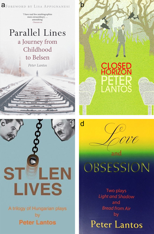 Fig 7 The silver pocket watch from Bergen-Belsen on the top of my bureau Reinventing myself as a self-employed author I had not planned to write a book about my childhood. However, with a large amount of material from my travels, I started to make notes as a sort of aide memoire. The experience at the beginning was quite unsettling, for there was an element of emotional involvement, completely different from the impersonal, objective and sparse style of medical/scientific writing – something I had practised for four decades. However, in the end, I had a manuscript and one of my friends, an editor, found a small publisher. Parallel Lines – a Journey from Childhood to Belsen was first published in 2006 by Arcadia Books London (Fig 8a). It was well received both in this country and abroad; it was translated into Hungarian (Sínek és Sorsok, Scolar 2009), Italian (Tracce di Memoria, Giunti 2015) and German (Von Ungarn nach Bergen-Belsen und zurück, Wallstein 2017). After attending medical/scientific meetings, symposia and workshops, it was a great change and exciting to be invited to literary festivals and book launches in this country, the USA, Germany, Hungary, Australia and New Zealand. After Parallel Lines I wrote a novel, Closed Horizon, also published by Arcadia Books in 2012 (Fig 8b). It is a dystopic novel which takes place in the surveillance state of the near future and it is a clash between the individual and the darker power of the state. “The play’s the thing” (Shakespeare) I never had any intention of writing plays and it was only the love of theatre which lead me to a short course, organised by the Writing Academy of the publisher Faber and Faber, on writing plays in 2012. The course was good fun with two excellent tutors: one being a well-known playwright and the other the artistic director of a Central London theatre. Thus, my playwriting “career” is entirely accidental, but I enjoyed the idea of trying to bring characters to life by creating inner tensions and external conflicts. The research, which was essential for the historical background and characters of the plays, was very similar to the excitement of discoveries of medical research. Yet the world of theatres, actors, directors and agents is far removed from the medical/scientific environment. It was not any less revelatory and exhilarating, yet far more uncertain and changeable – as if someone attempted to enter a mirage. Nothing exemplifies this more than the author relationships with publishers. Whilst medical publishers came to ask, or even begged, authors to write for them, one has to find a publisher in the in the literary world where there are over 160,000 titles a year. The first three play were collected into a volume, Stolen Lives to form a trilogy (Regent Books London 2018; Fig 8c). All three take place in Hungary against historical turning points: The Visitor during the Second World War; Distorting Mirrors in the 1956 Revolution and Stolen Years at the fall of Communism in 1989. In all three, the source of drama is the same: human tragedy, in the form of an irredeemable conflict between vulnerable individuals and brutal authoritarian dictatorships relentlessly motivated by an obnoxious ideology, be it Fascism or Communism. I have completed two more plays. Light and Shadow is the extraordinary love affair which shook puritanical Victorian London between the French painter James (Jacques) Tissot and Kathleen Newton, a Catholic Irish divorcée with an illegitimate child. My last play, Bread from Air: the Strange Case of Dr Haber has perhaps the most complex of characters: Dr Fritz Haber the Nobel Laureate in Chemistry (1918), who by producing ammonia from hydrogen and nitrogen, the basic substance of fertilisers, is credited with saving the lives of two out of the seven billion people alive today. Yet, it was also he who produced (on a scientific basis) poisonous gases, one of which was first introduced in 1915 against French troops at Ypres. His private life was as contradictory and colourful as his professional career. He lived long enough to be refused entry by the Nazis into the Institute he founded and that bore his name. Fortunately, he did not survive to witness the death of some of his relatives in Auschwitz, who were murdered by the same poisonous gas his team had experimented with in the 1920s. These two plays were published in a volume, Love and Obsession (Regent Books, 2019; Fig 8d).